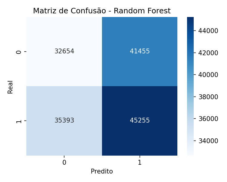 O modelo apresentou acurácia de 50%, indicando desempenho equivalente a uma previsão aleatória.