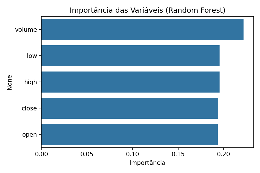 - A importância das variáveis indica que as features mais relevantes foram: - close (fechamento do dia anterior); - high e low, que refletem volatilidade diária; - volume, com menor peso.